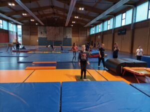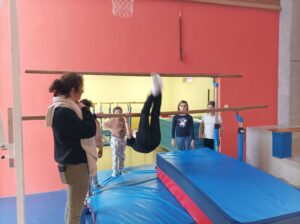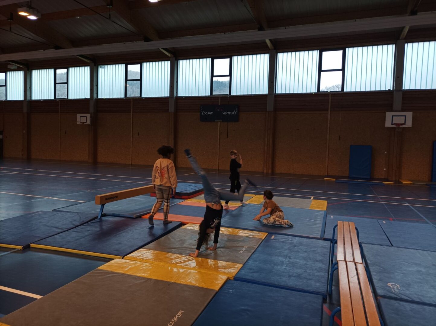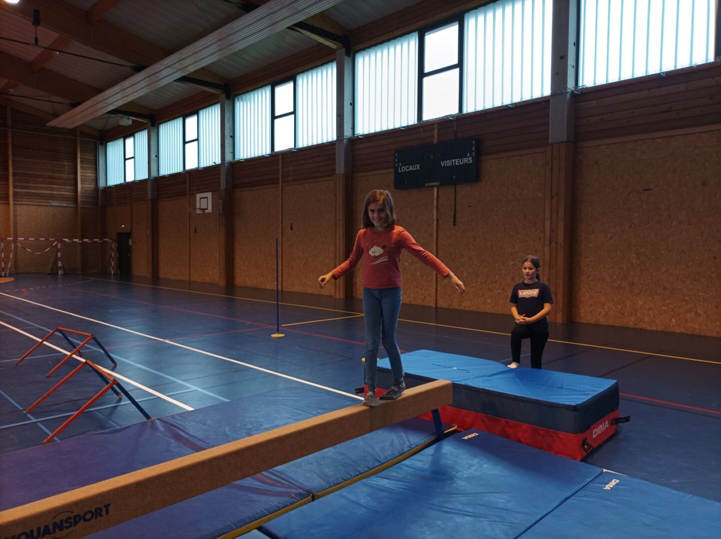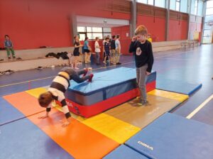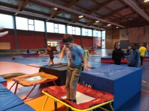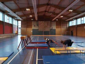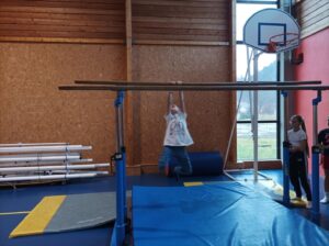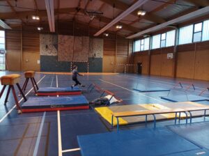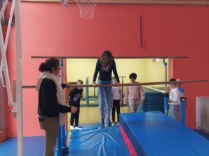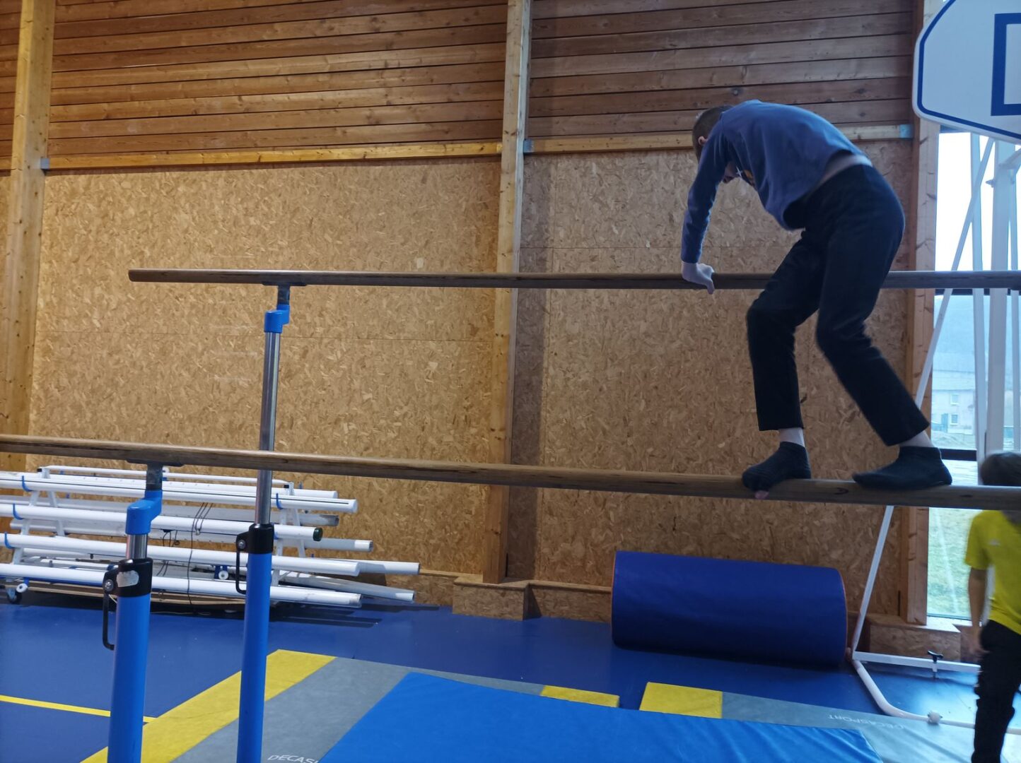 Au gymnase nous faisons de la gym : des barres parralèlles, des roulades, des ATR et des sauts.