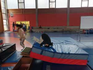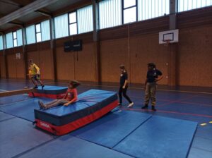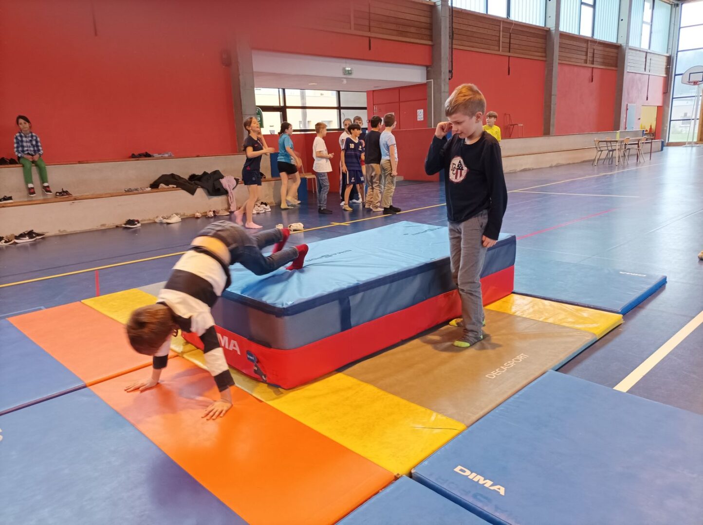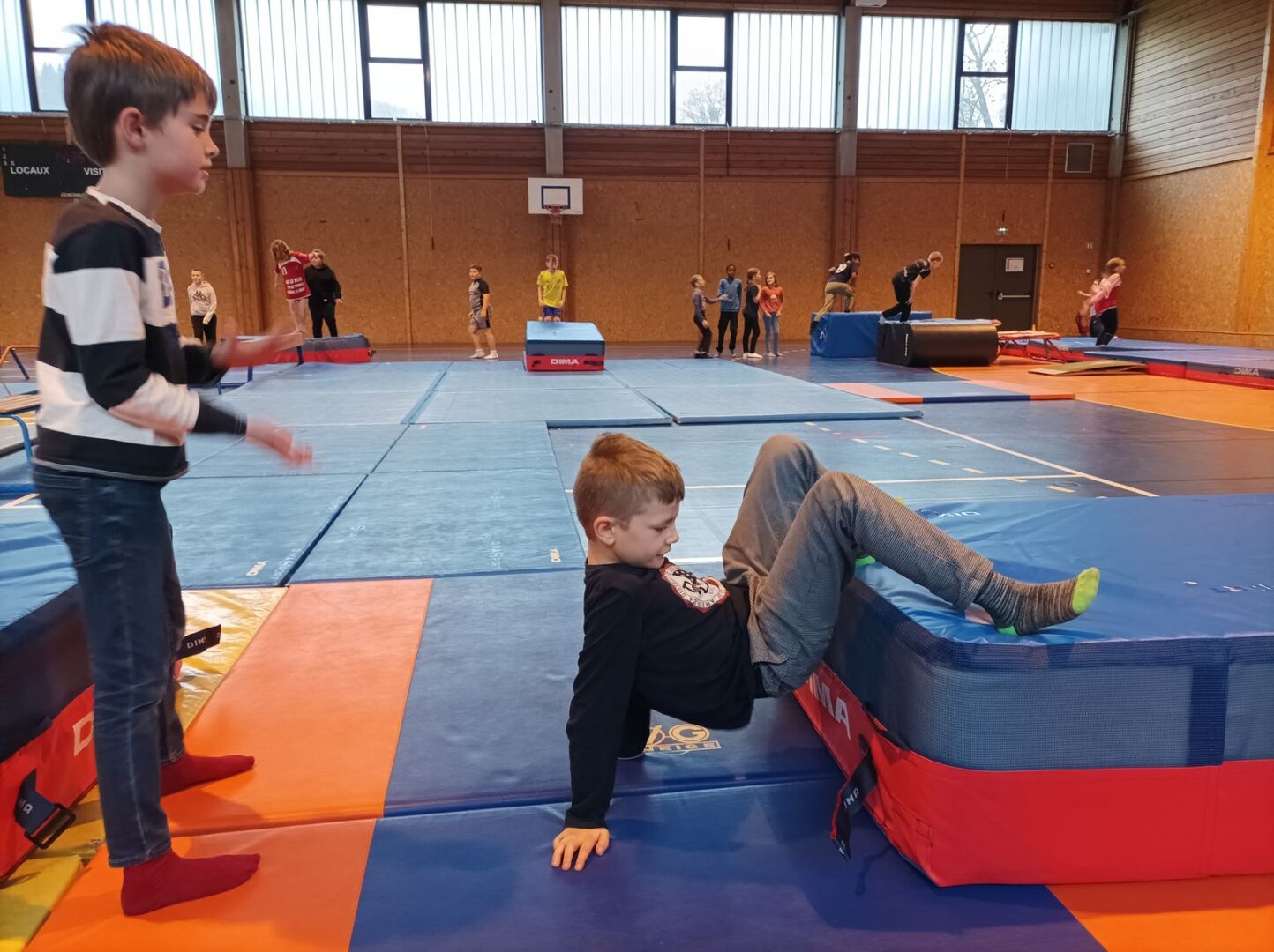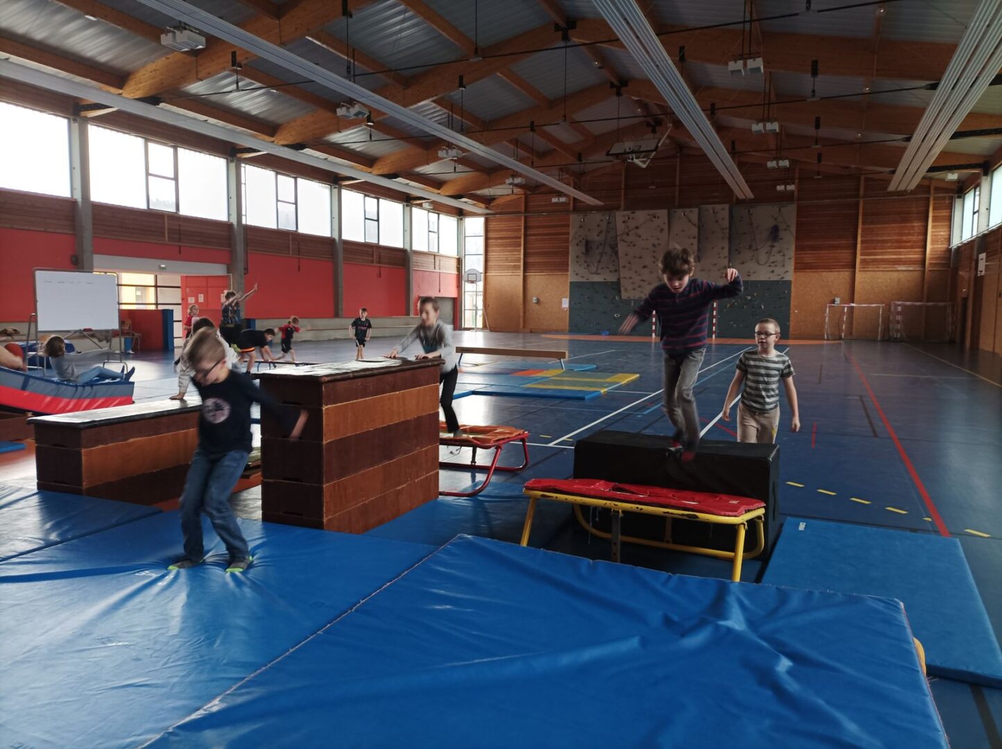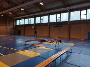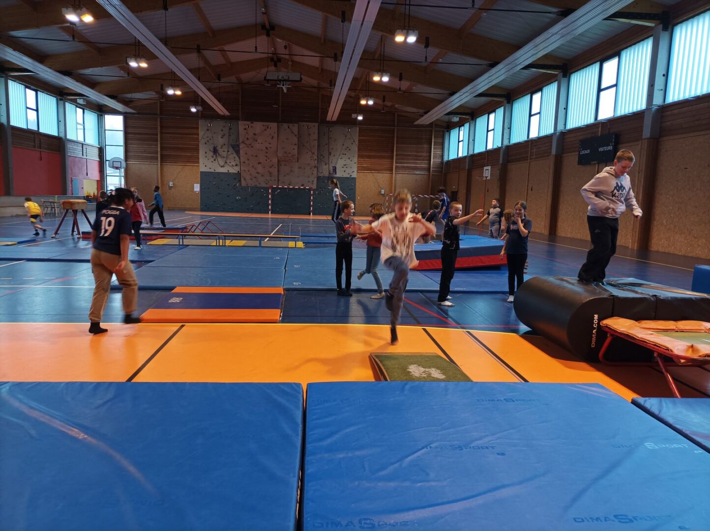 Au gymnase nous faisons de la gym : des barres parralèlles, des roulades, des ATR et des sauts.