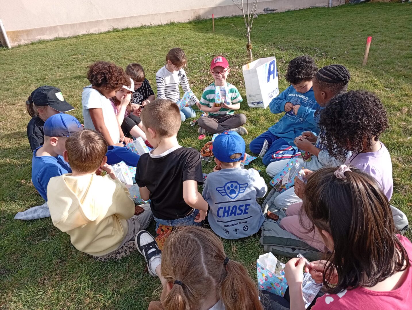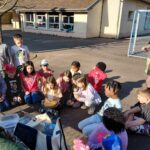 Afin de profiter des températures printanières de ces derniers jours, les CP/CE ont travaillé la lecture dehors ce vendredi après-midi, accompagnés d’une poule qui avait apparemment aussi envie d’apprendre à lire …