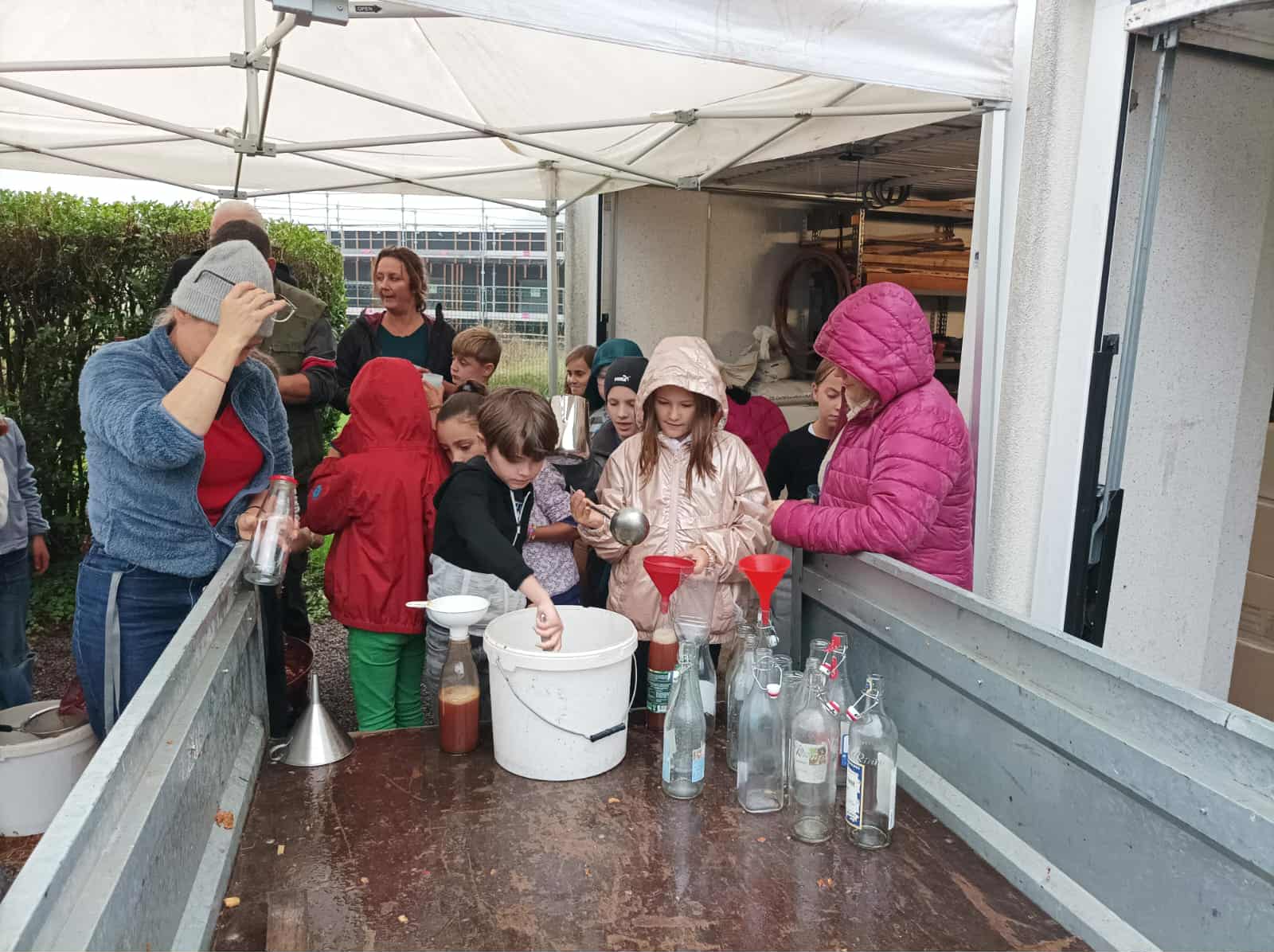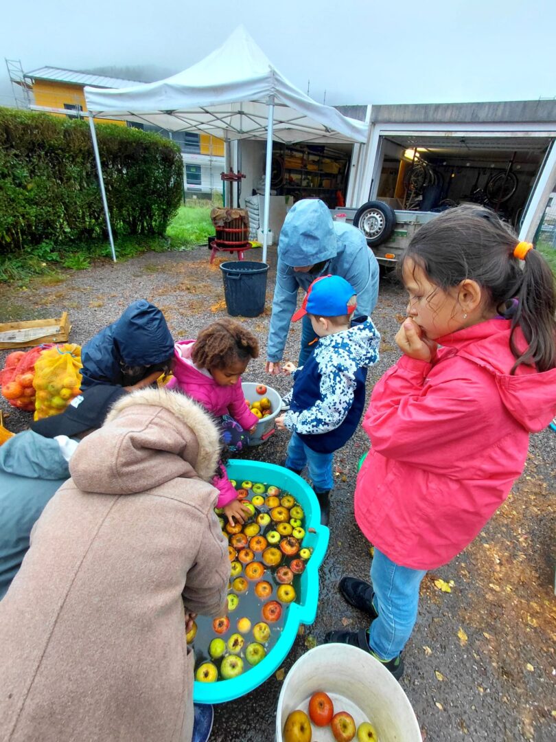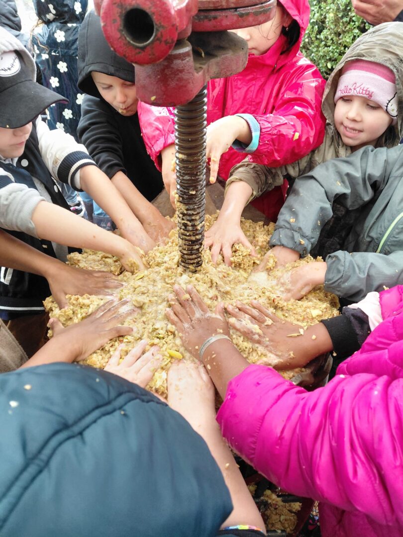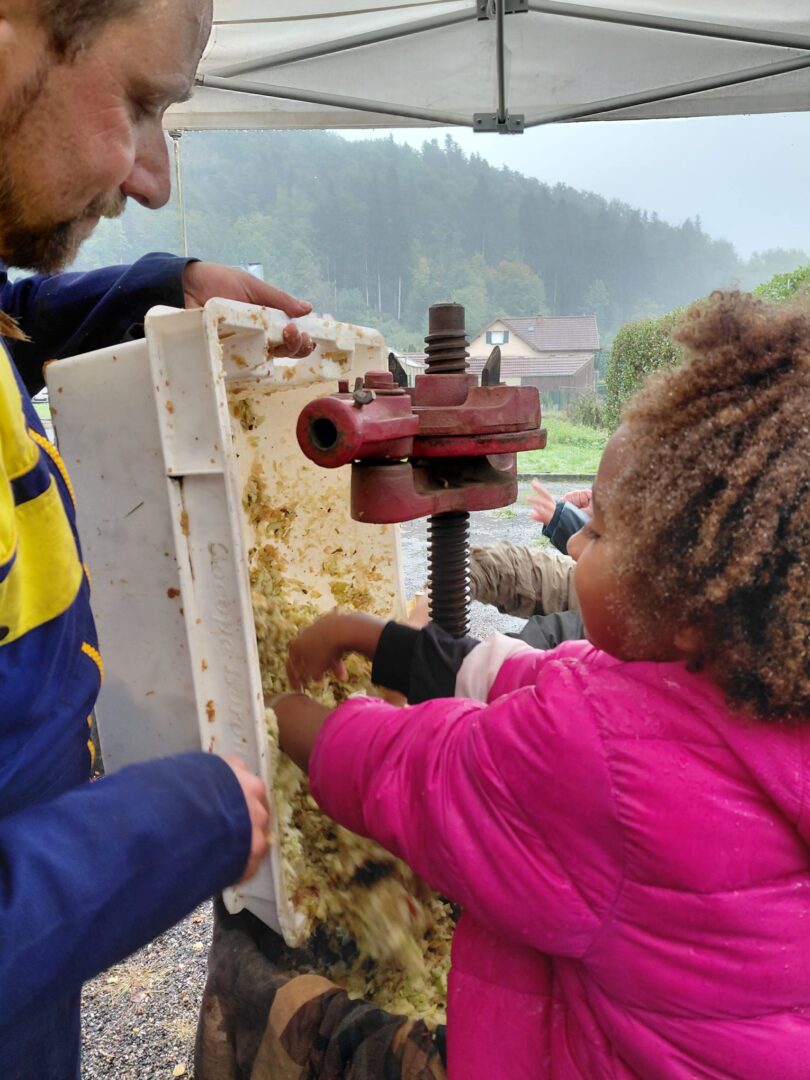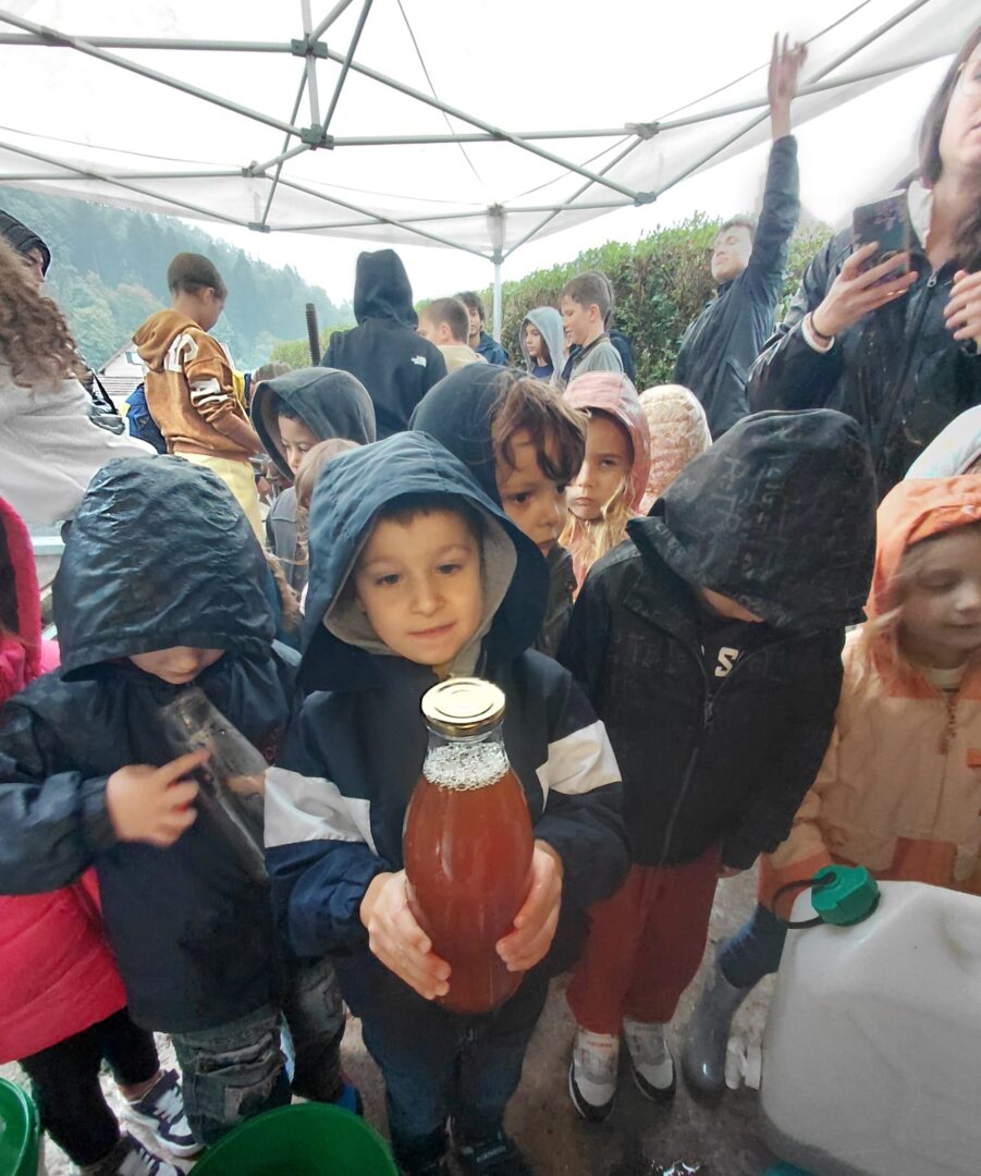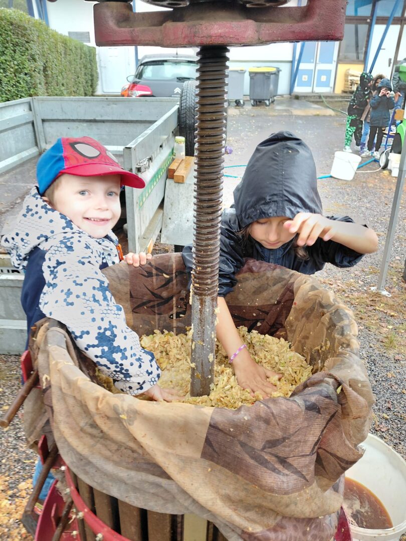 Même sous la pluie, la fabrication du jus de pomme est toujours un plaisir pour les enfants !