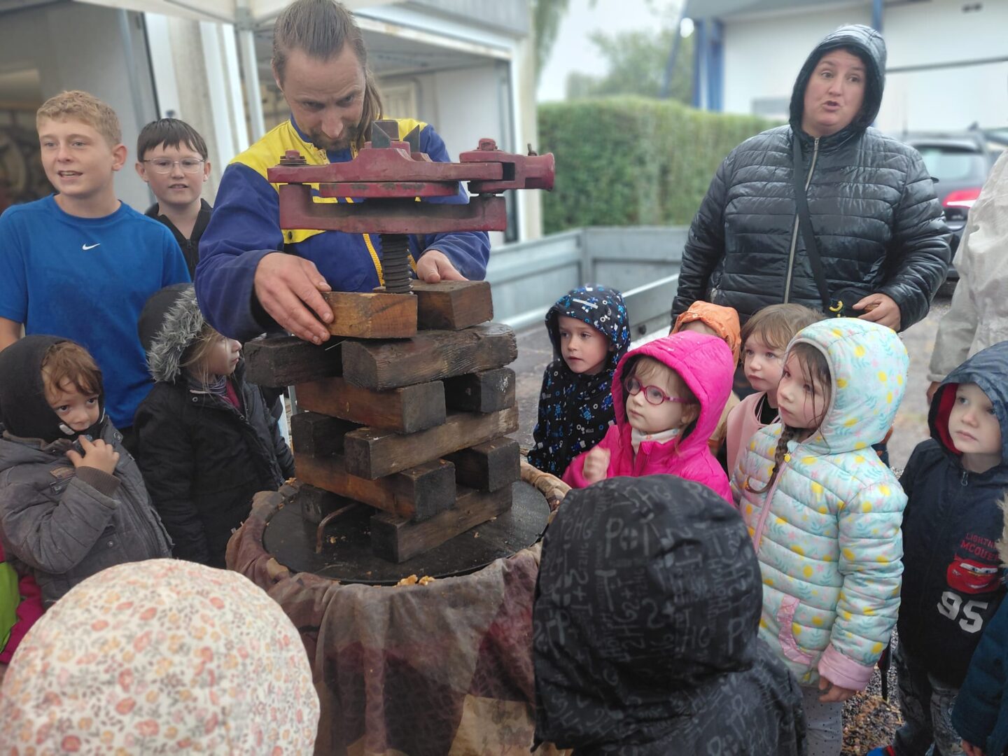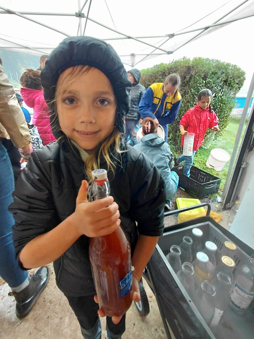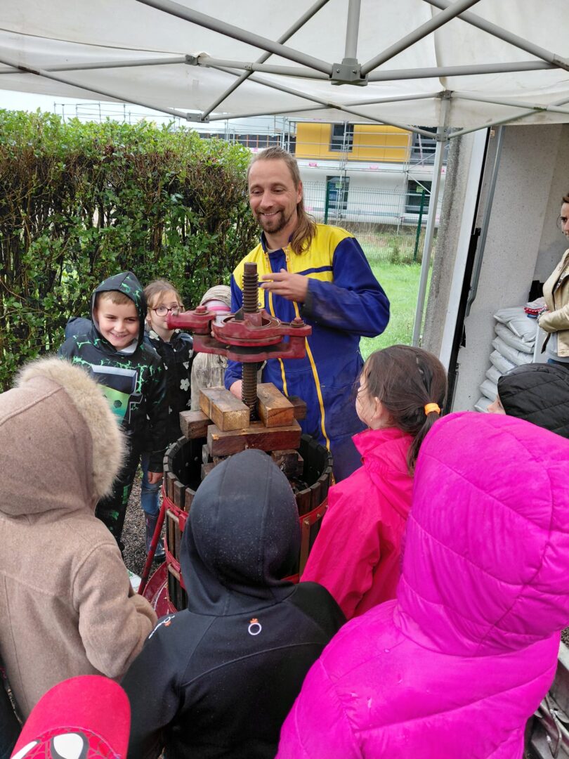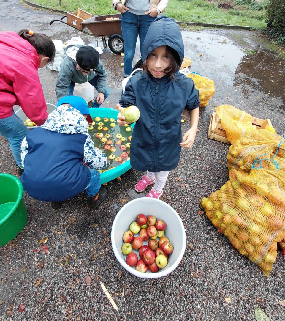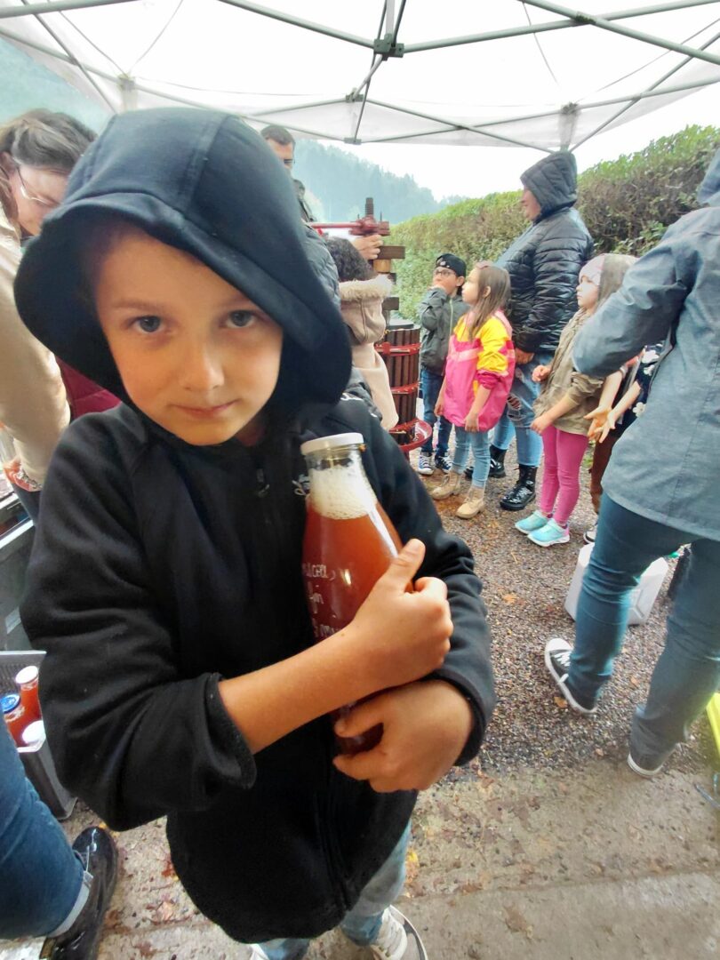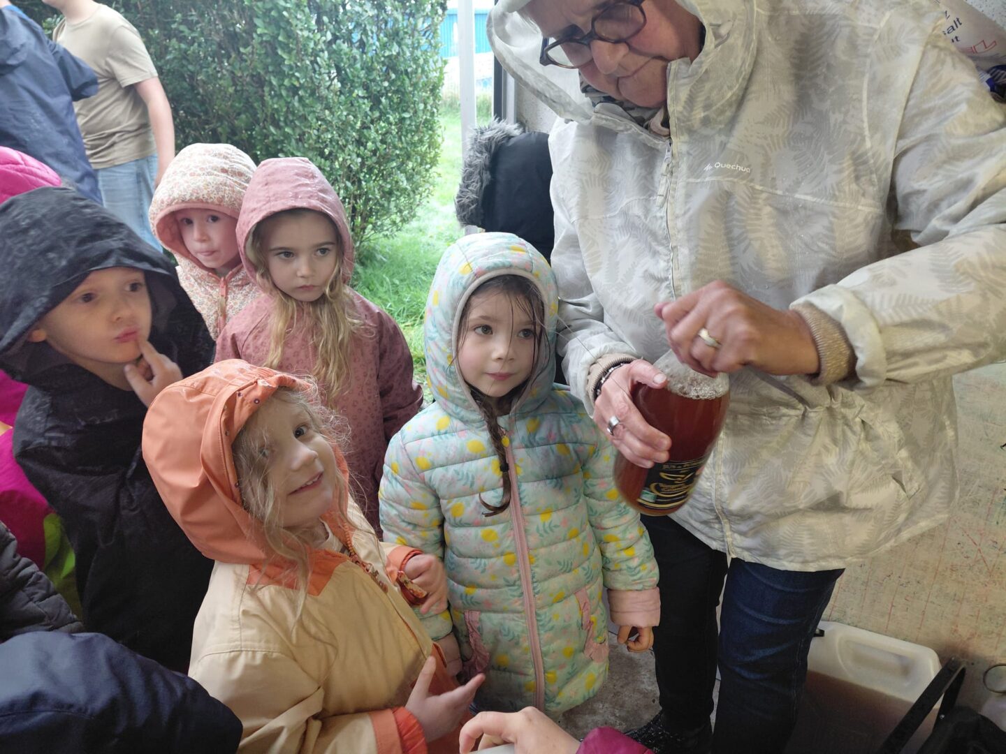 Même sous la pluie, la fabrication du jus de pomme est toujours un plaisir pour les enfants !