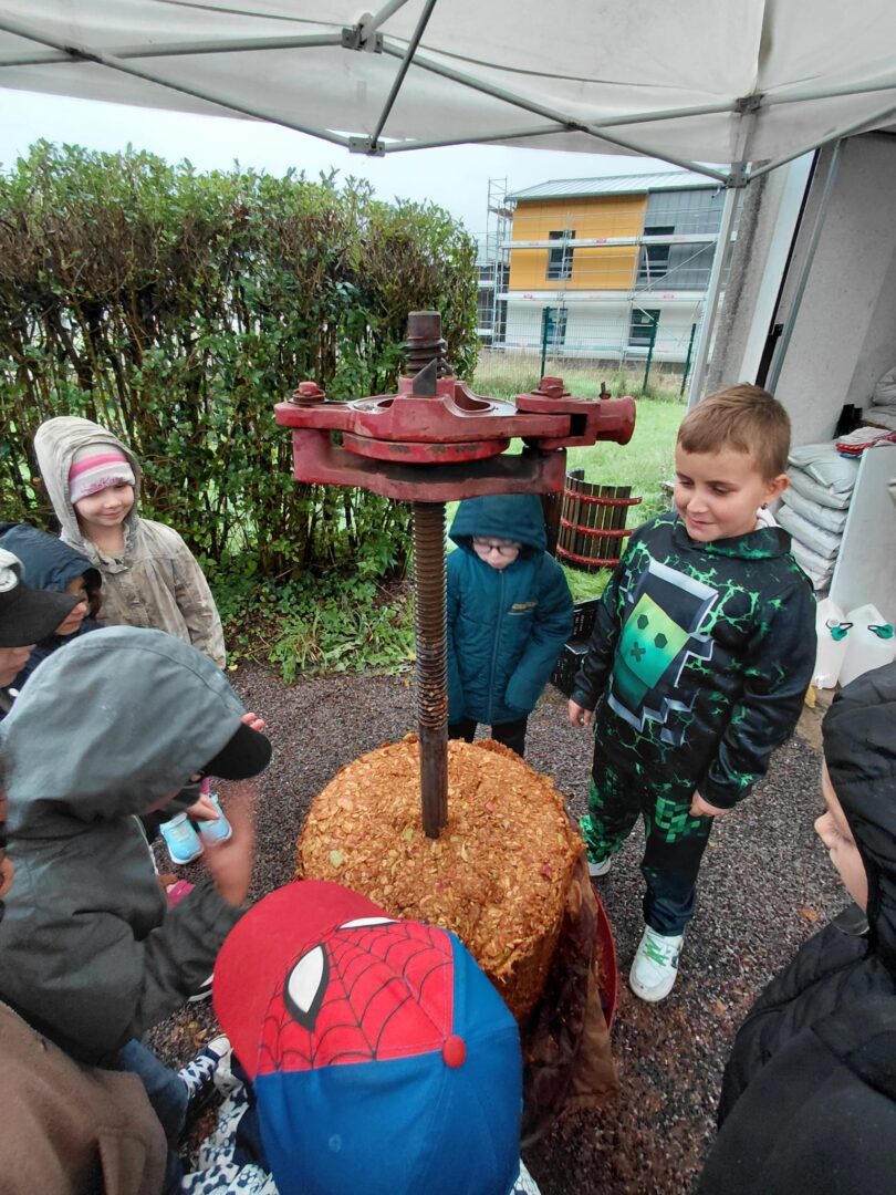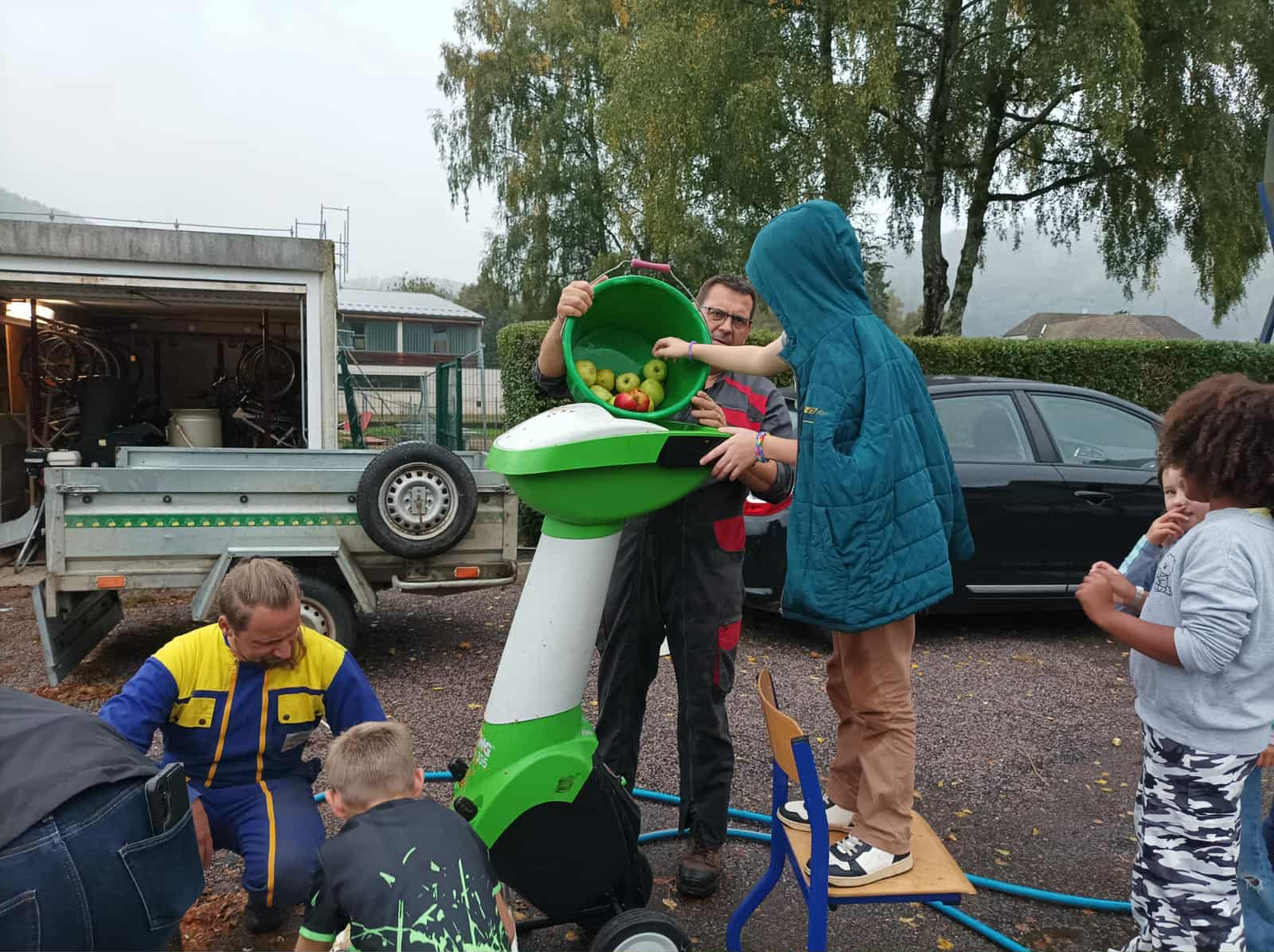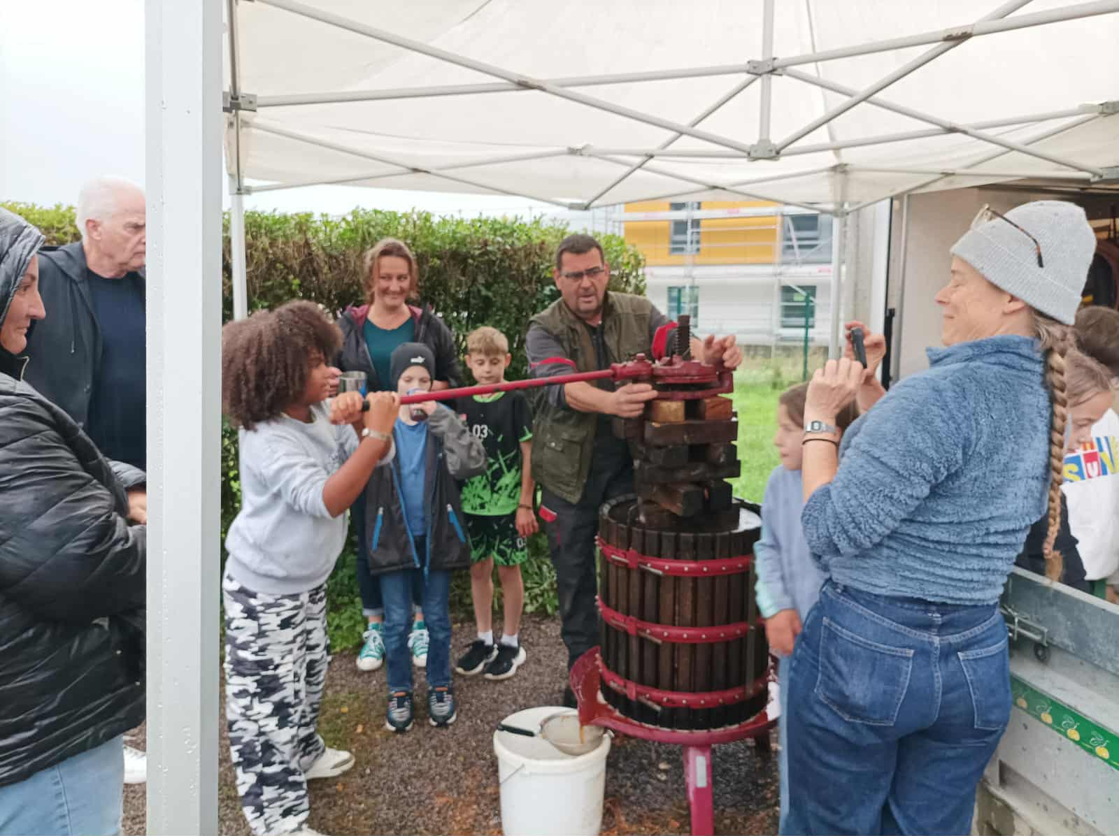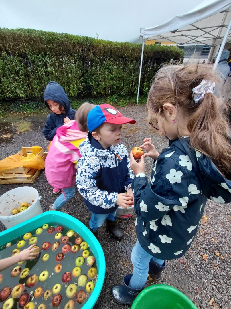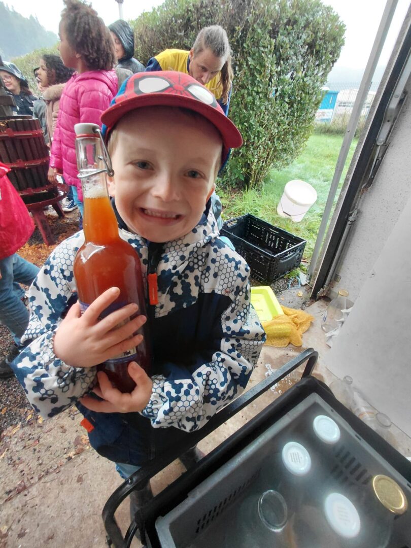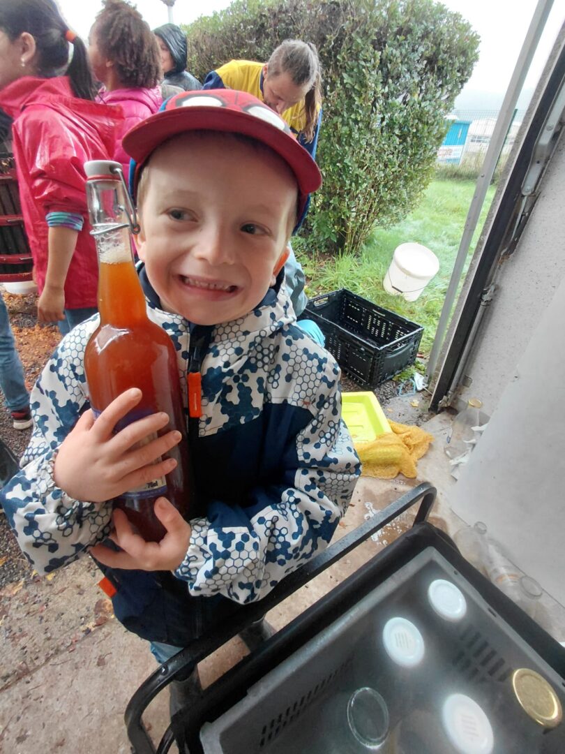 Même sous la pluie, la fabrication du jus de pomme est toujours un plaisir pour les enfants !