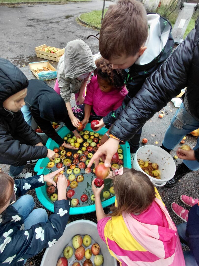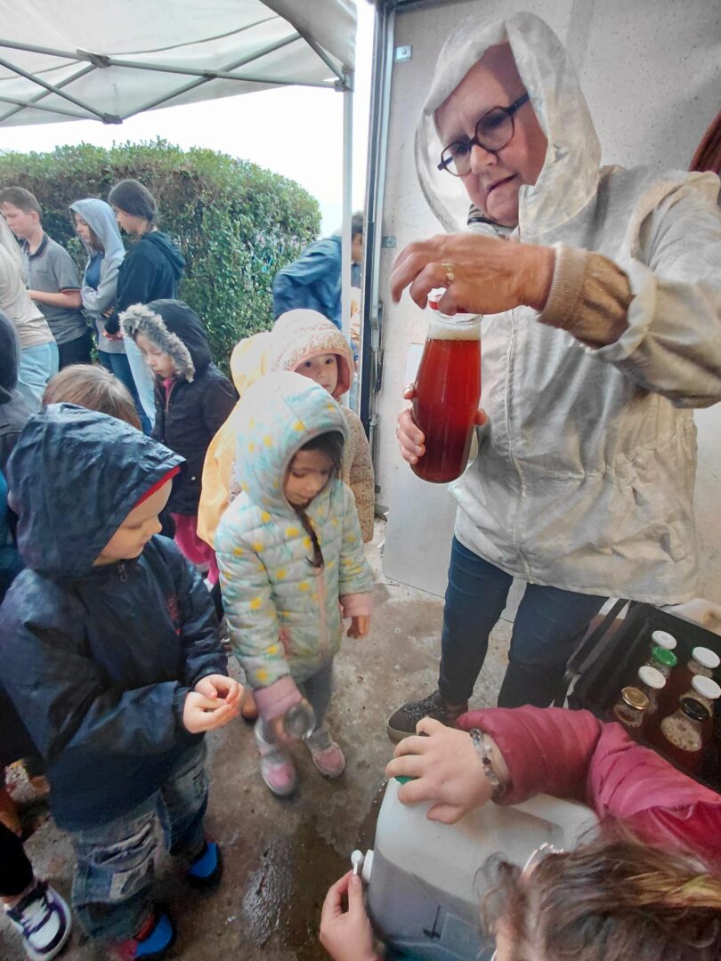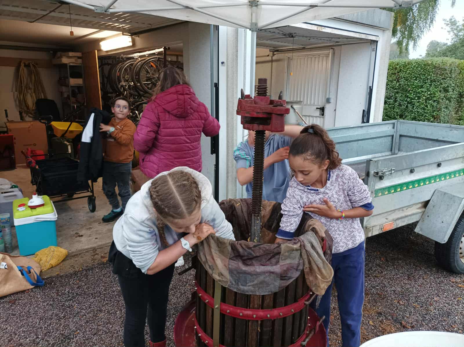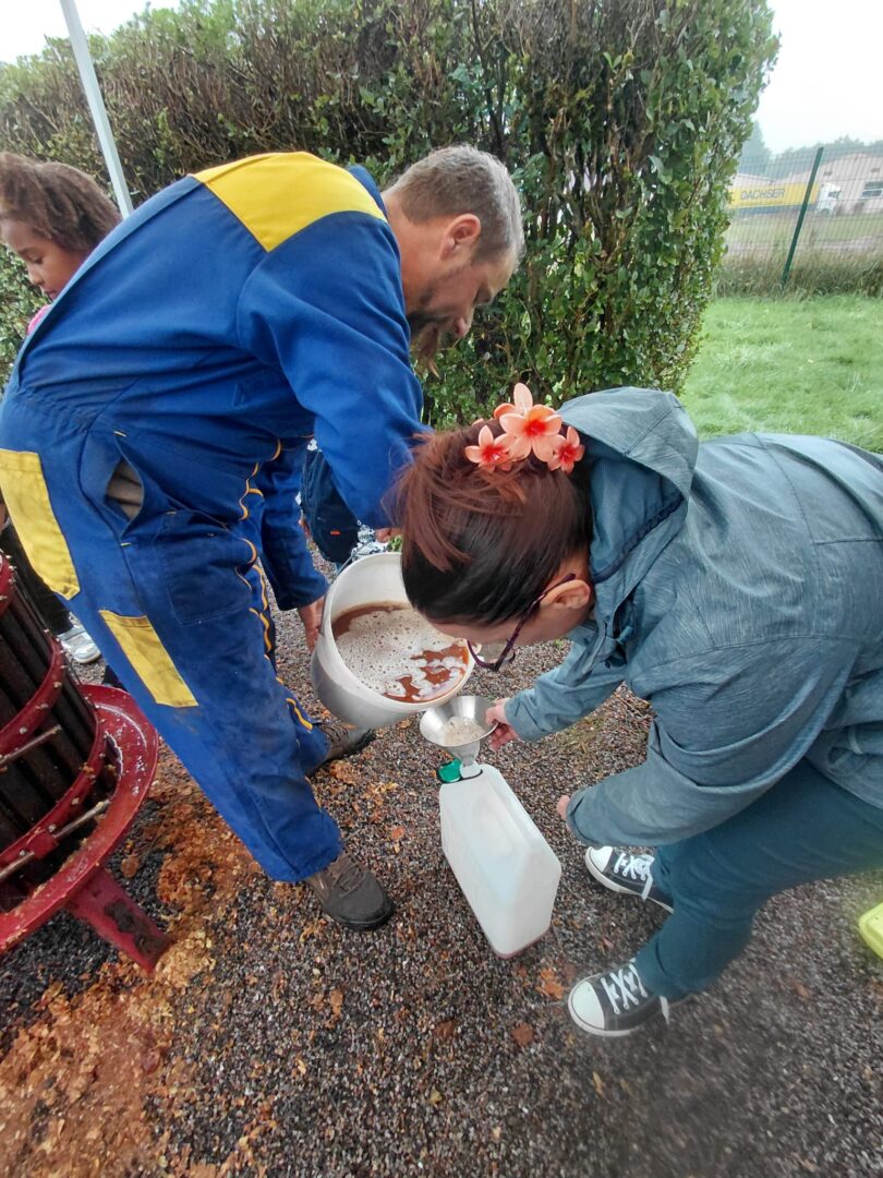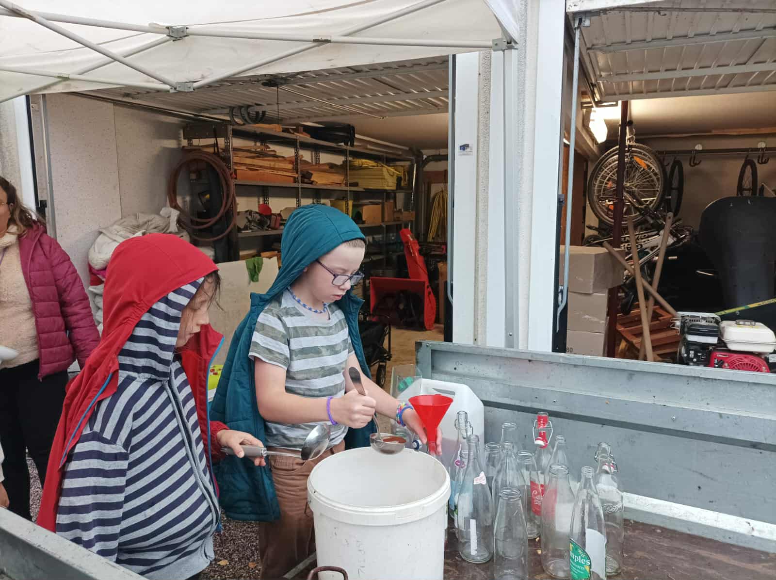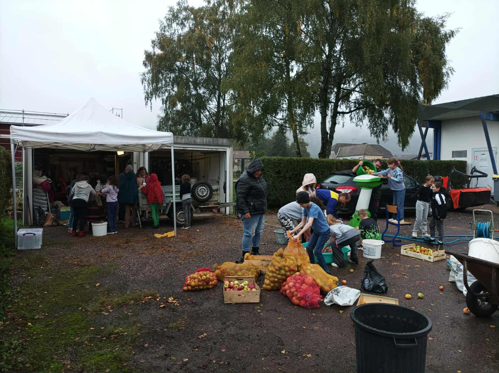 Même sous la pluie, la fabrication du jus de pomme est toujours un plaisir pour les enfants !