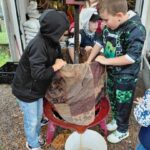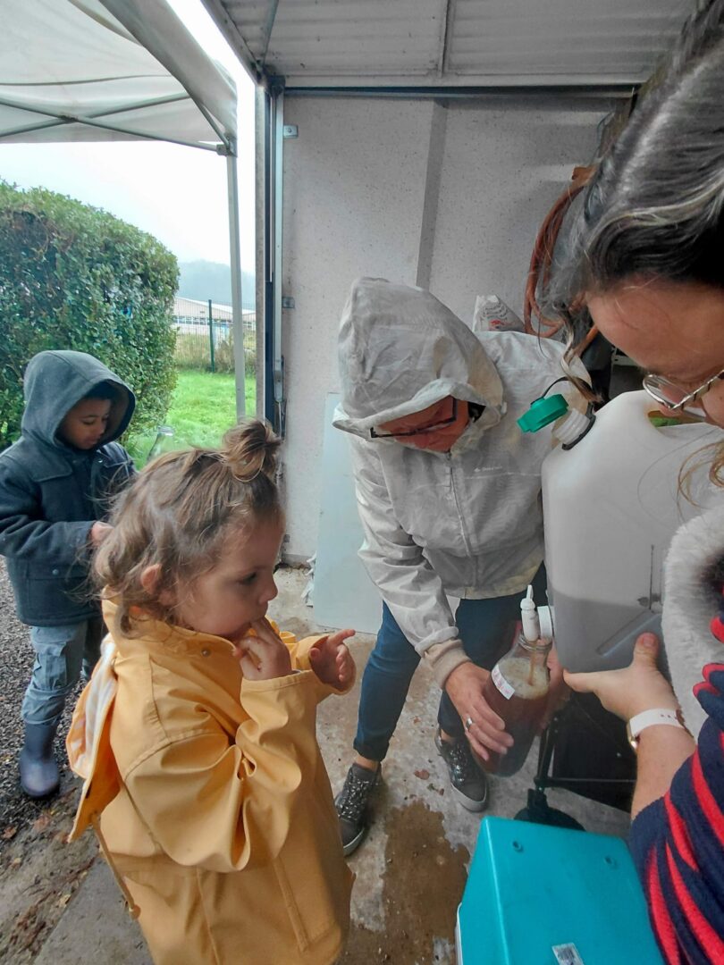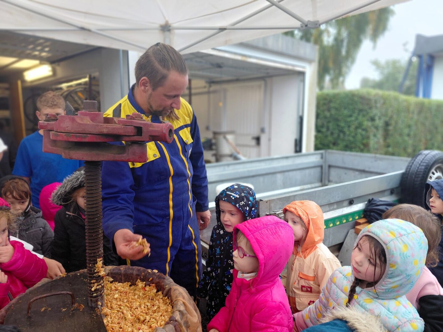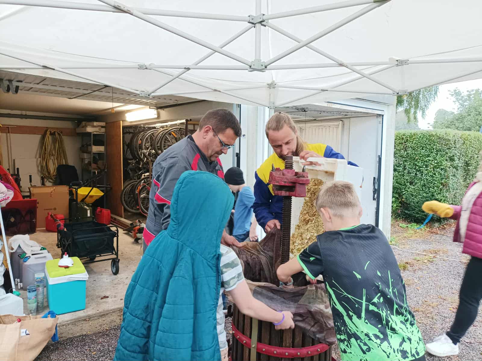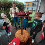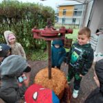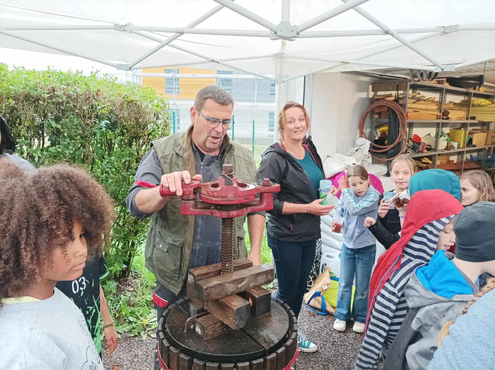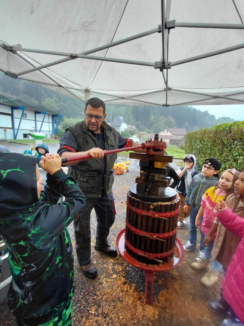 Même sous la pluie, la fabrication du jus de pomme est toujours un plaisir pour les enfants !