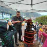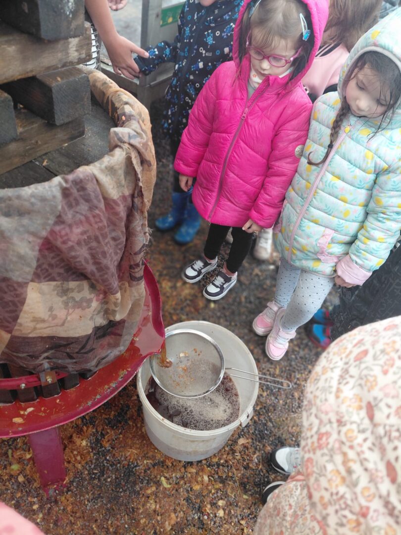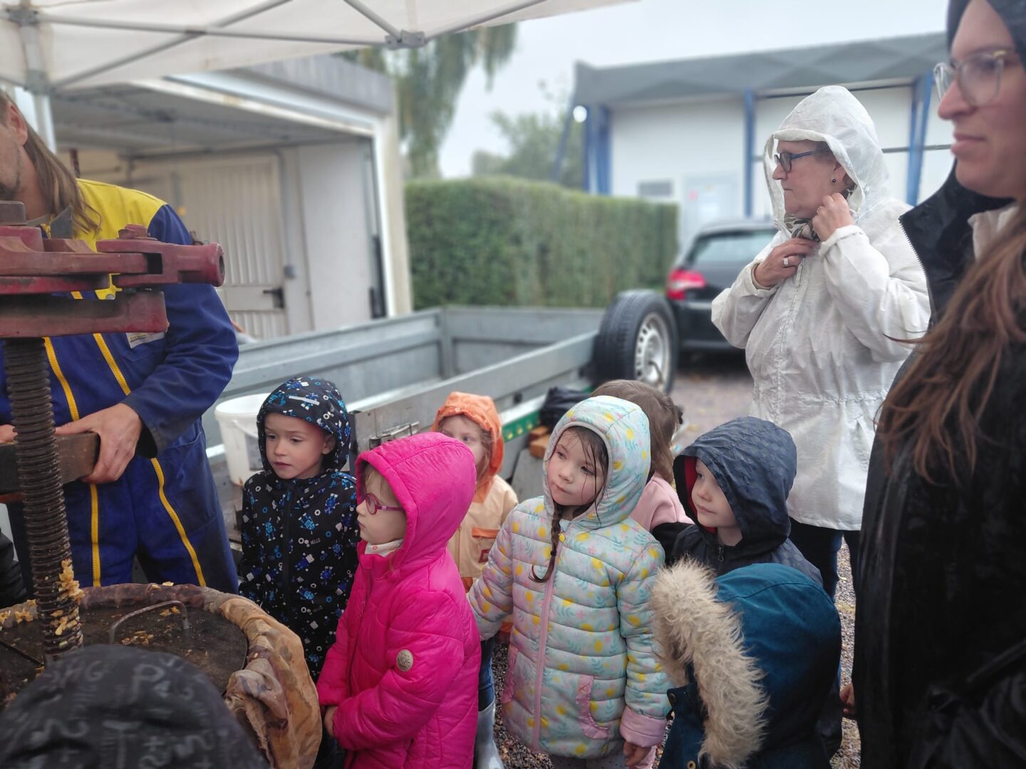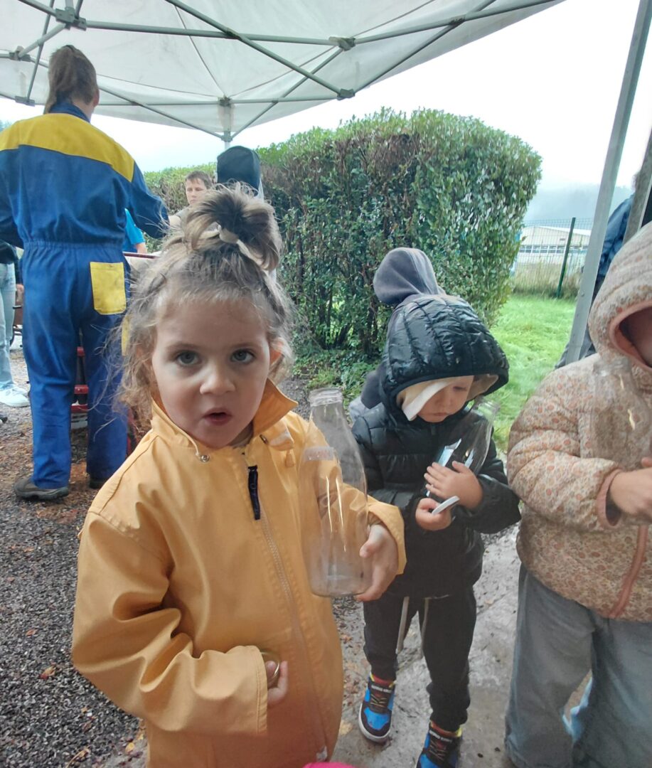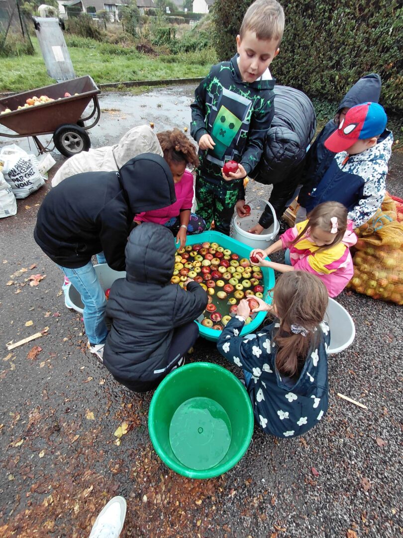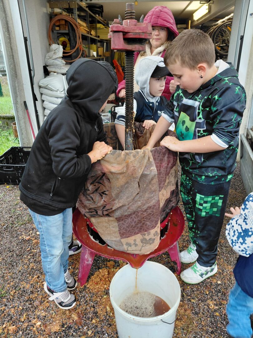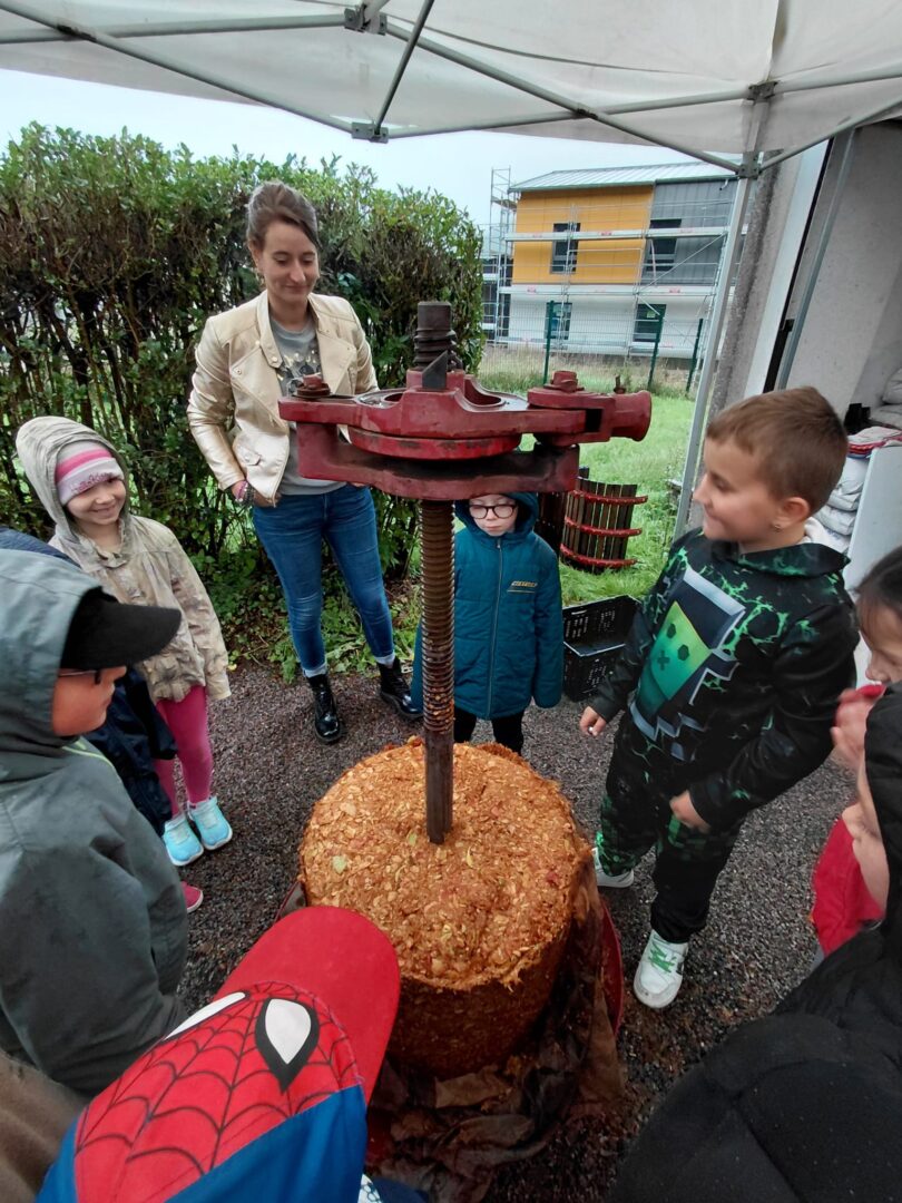 Même sous la pluie, la fabrication du jus de pomme est toujours un plaisir pour les enfants !