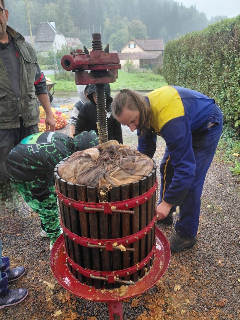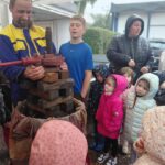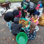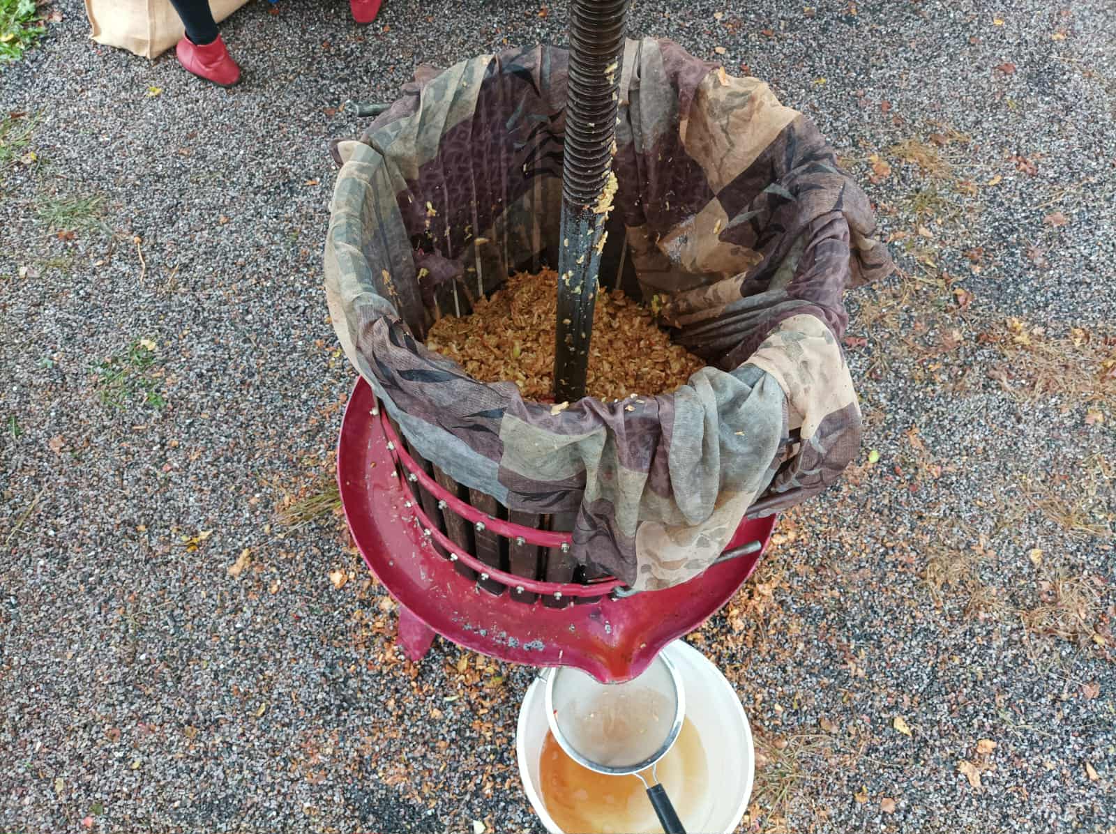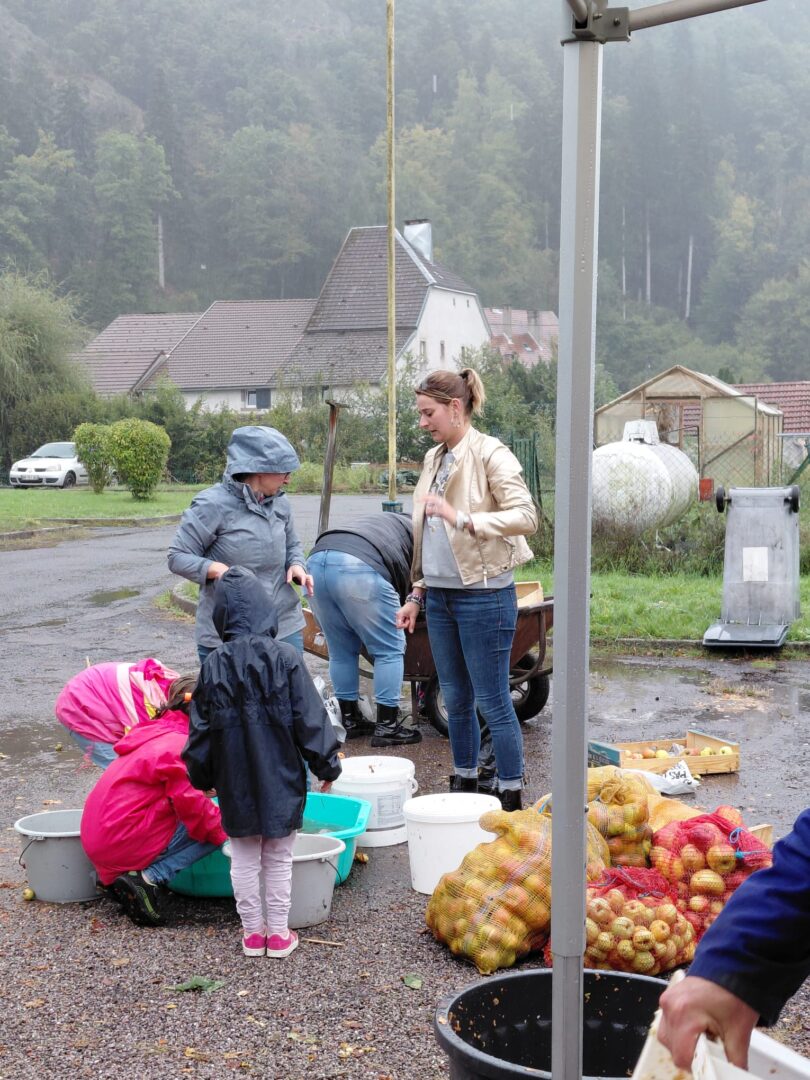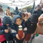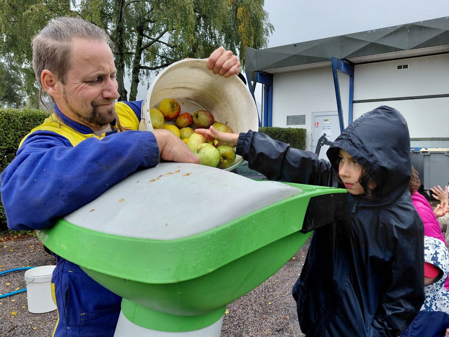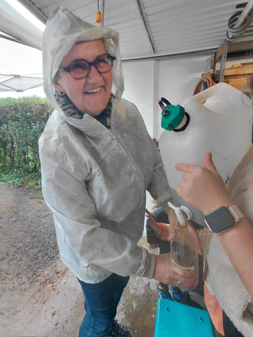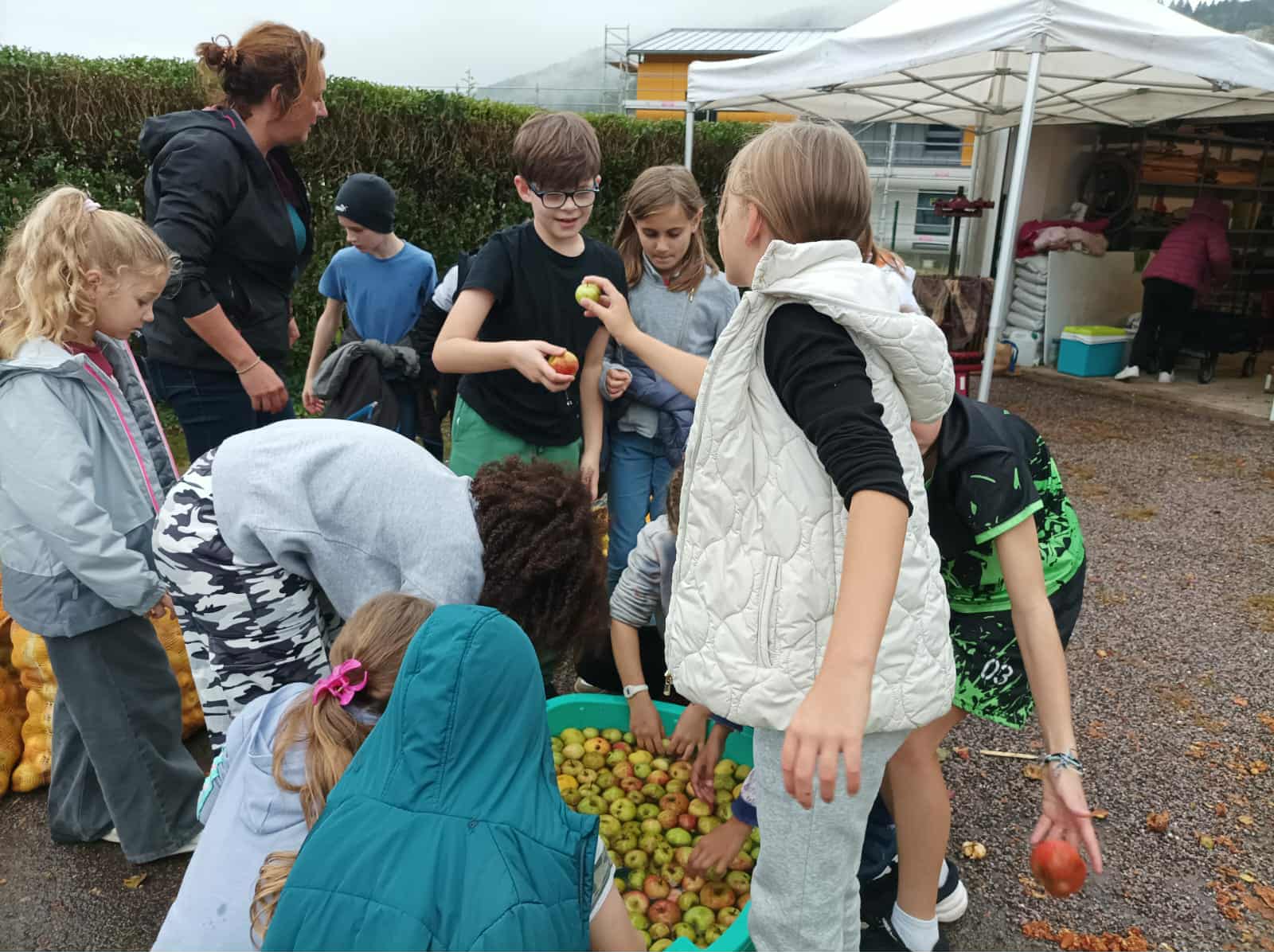 Même sous la pluie, la fabrication du jus de pomme est toujours un plaisir pour les enfants !