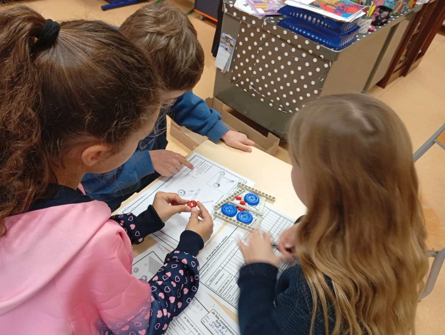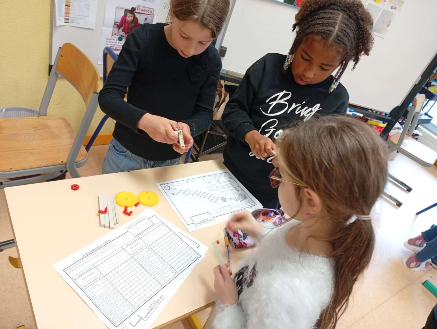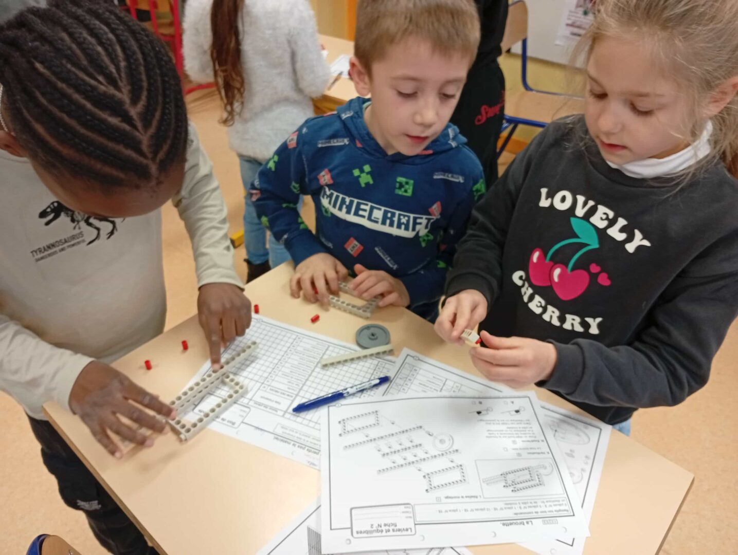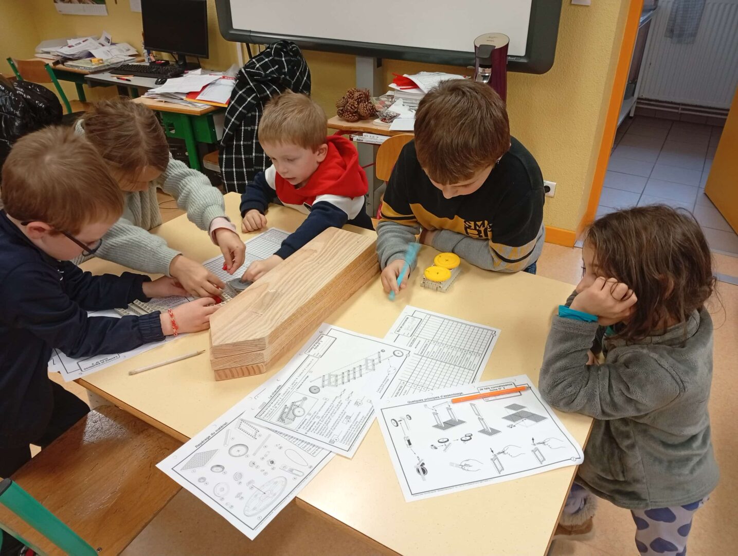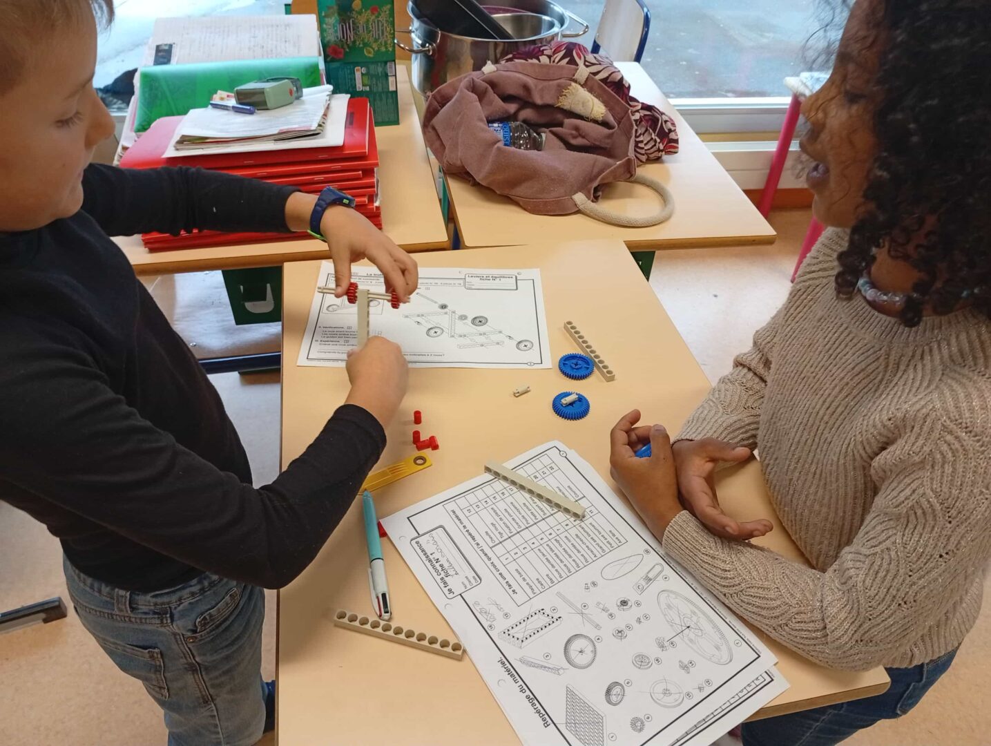 En groupe, ils se sont d’abord approprié le matériel avant de fabriquer ce jour des brouettes, charrettes et trottinettes par association de différents éléments, en suivant un schéma de montage. Un joli travail d’organisation, de patience, de coopération et de partage entre élèves.