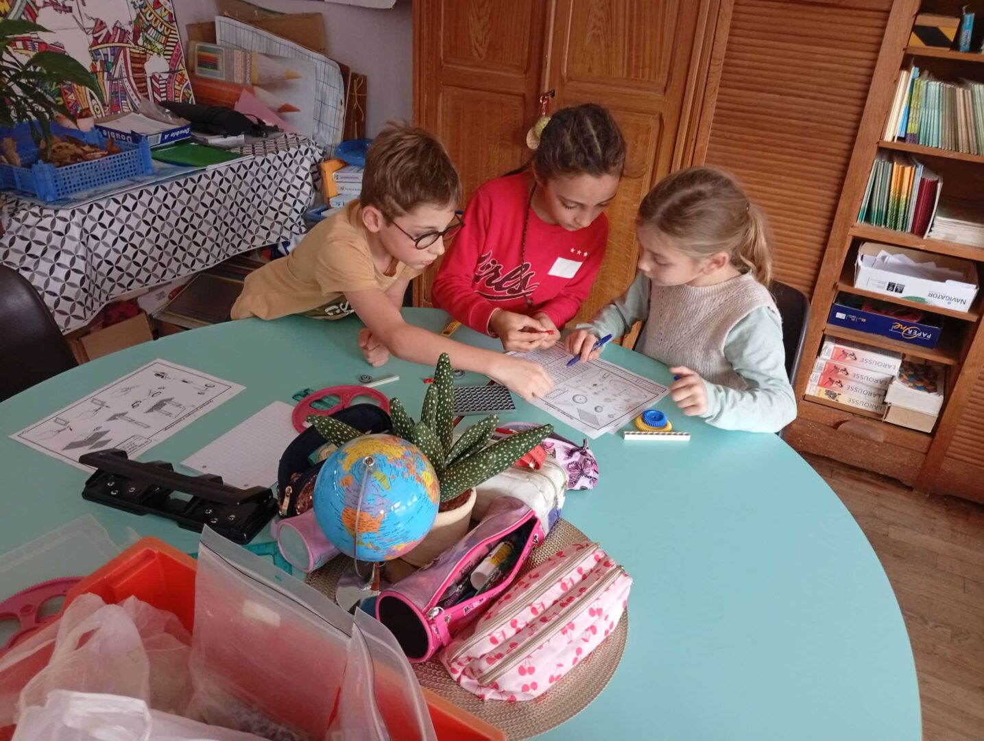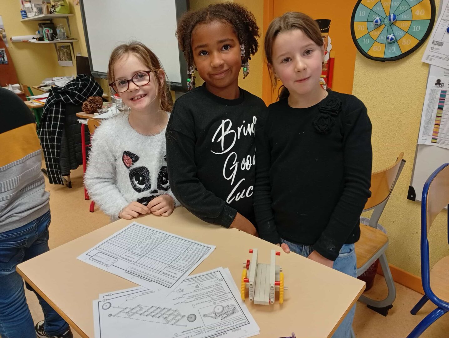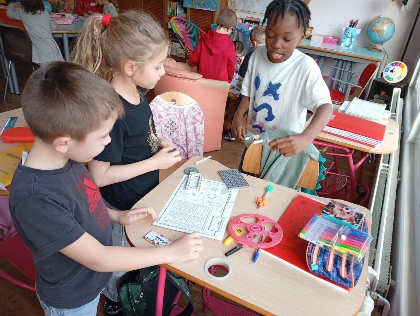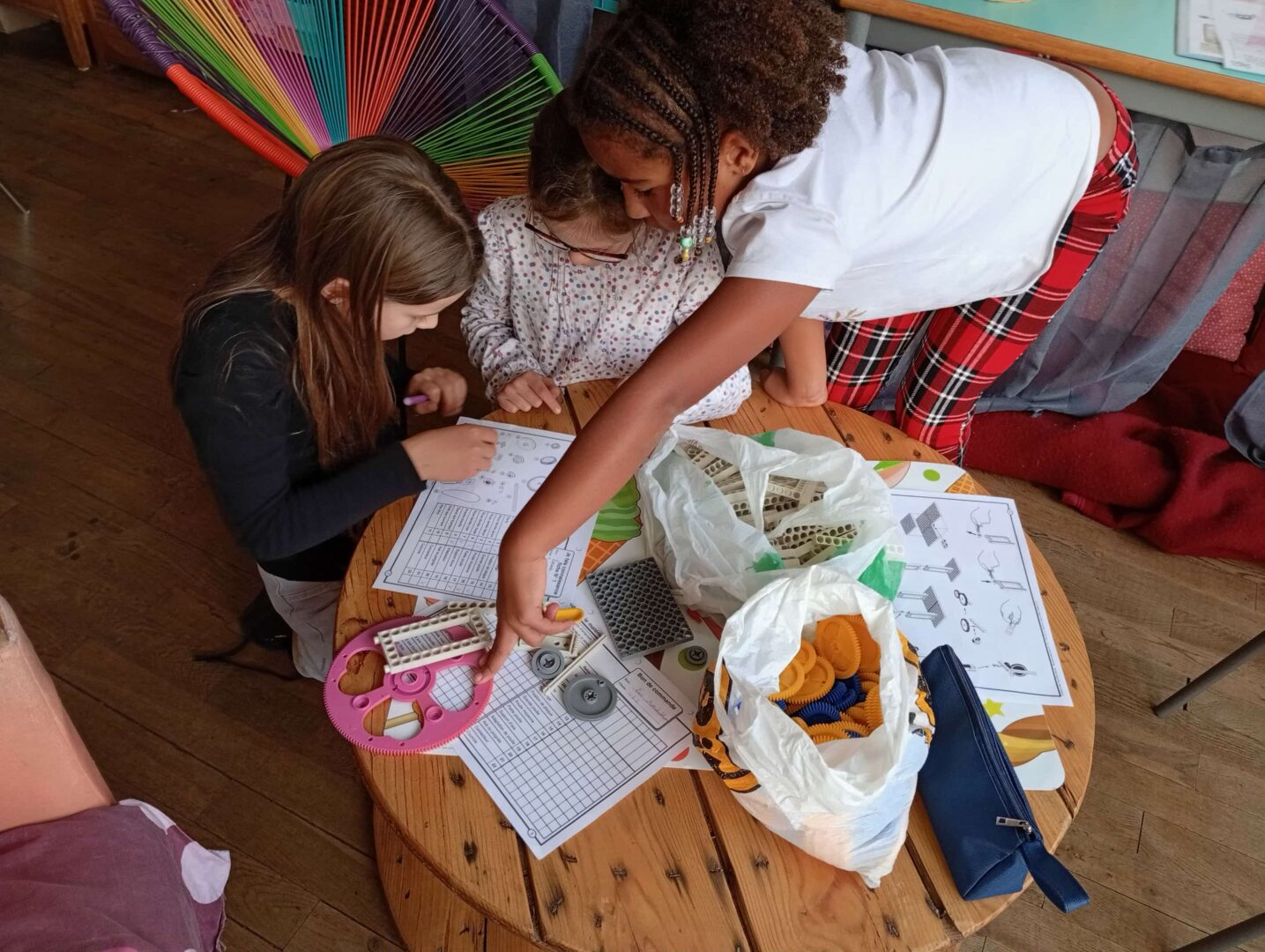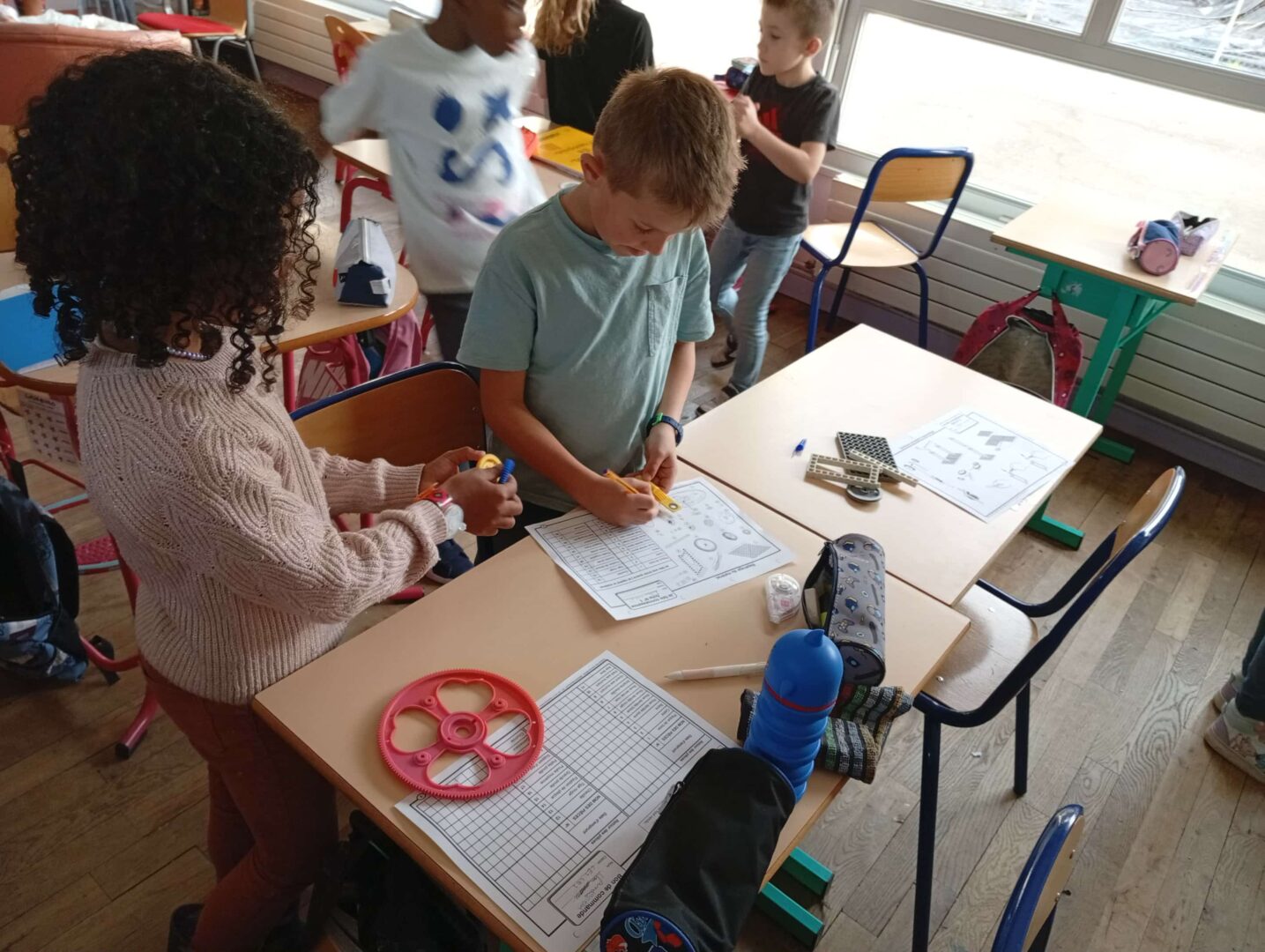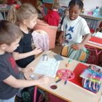 En groupe, ils se sont d’abord approprié le matériel avant de fabriquer ce jour des brouettes, charrettes et trottinettes par association de différents éléments, en suivant un schéma de montage. Un joli travail d’organisation, de patience, de coopération et de partage entre élèves.