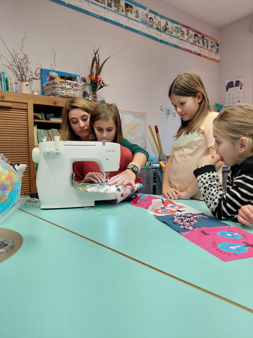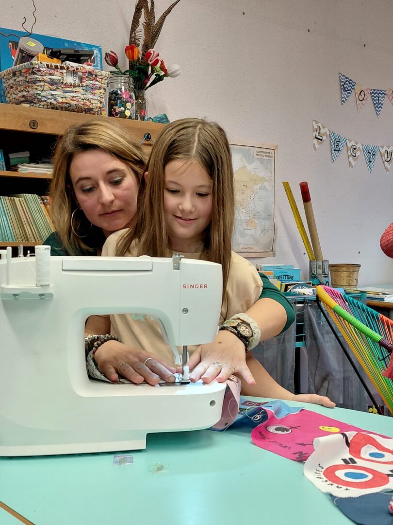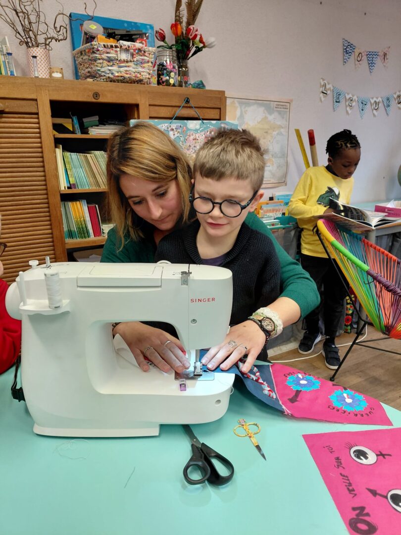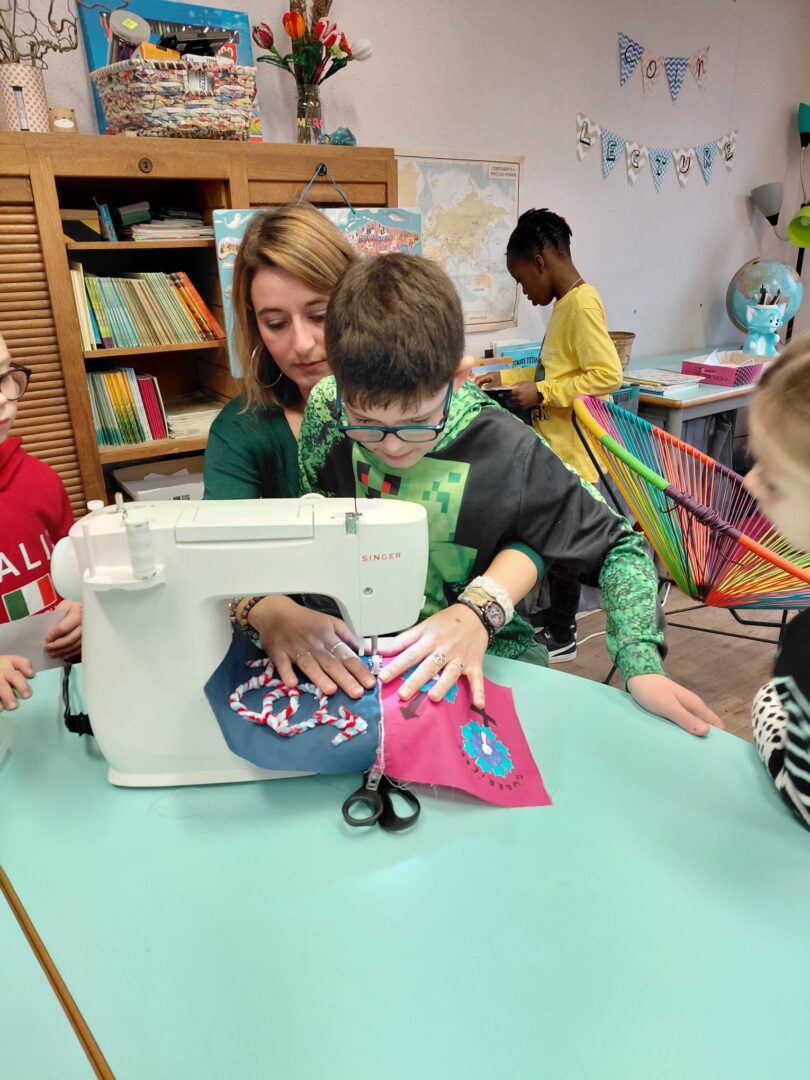 Ensuite on a cousu  les carrés de notre classe ensemble avec maitresse Justine