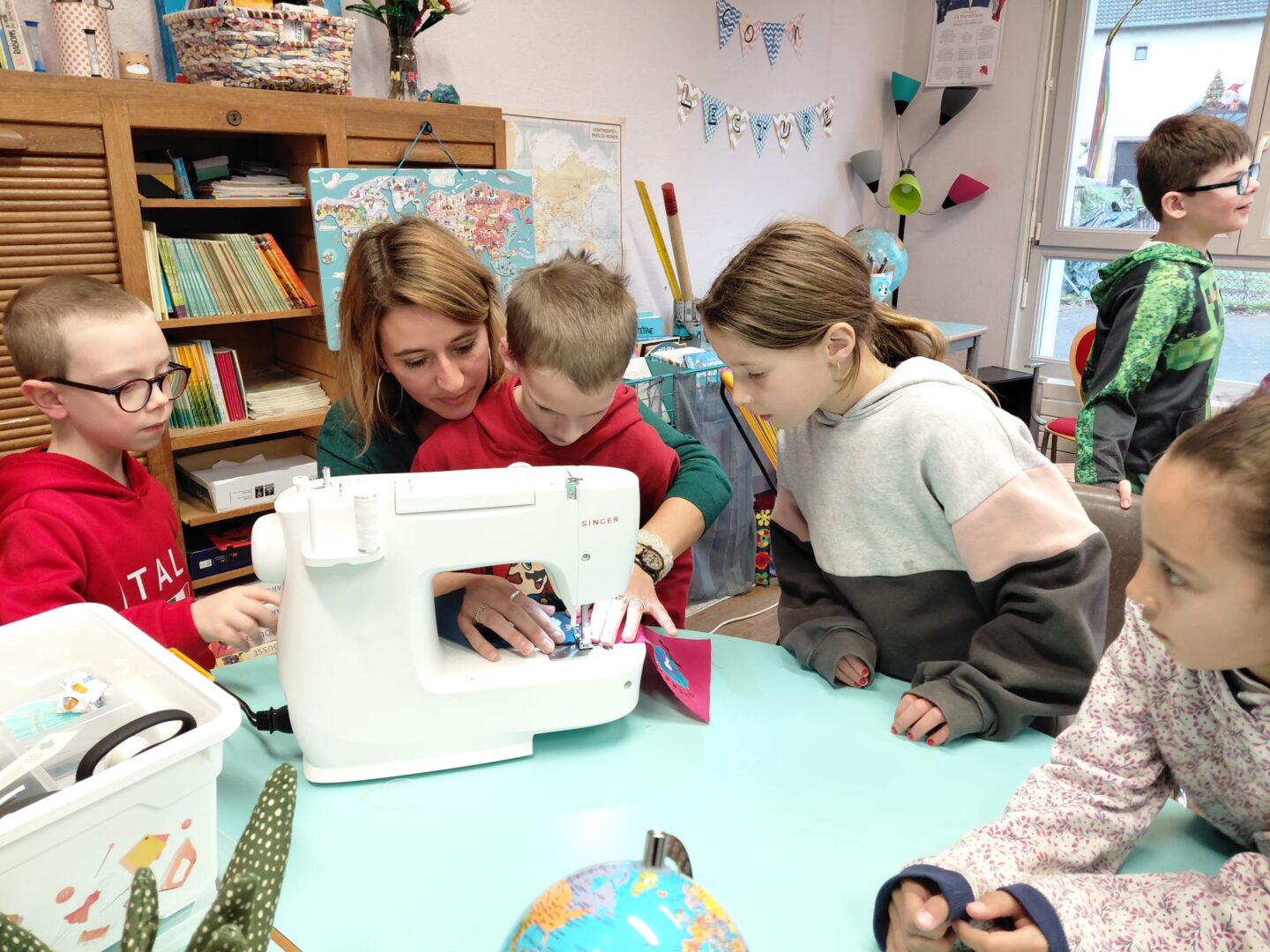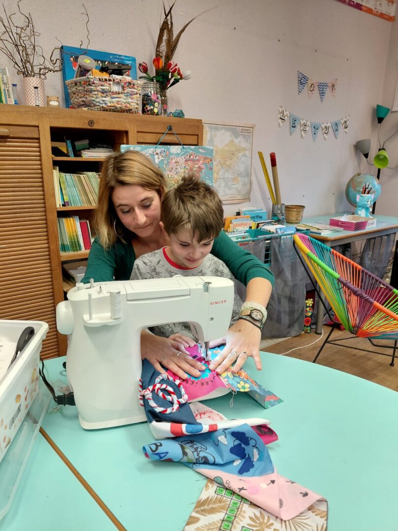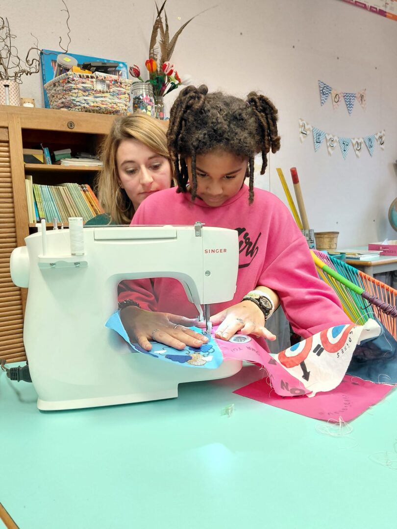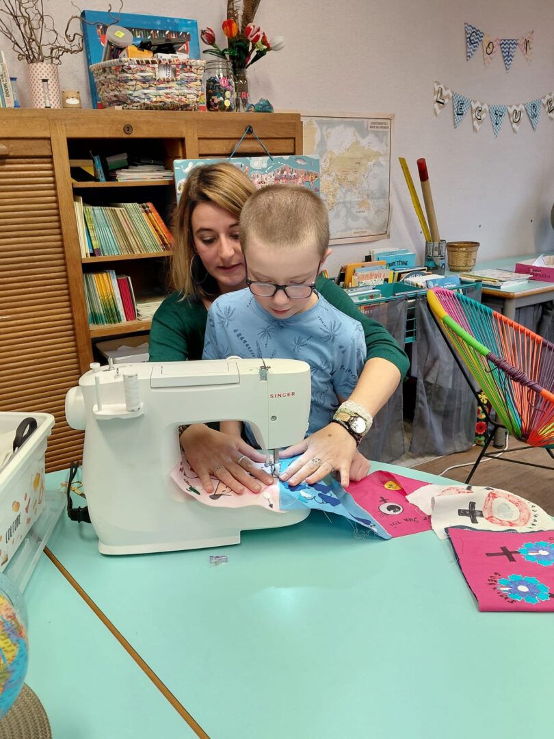 Ensuite on a cousu  les carrés de notre classe ensemble avec maitresse Justine