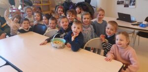 Les enfants de grande section ont réalisé une tarte aux pommes en suivant fidèlement les indications de mamie Eliane, l’un des personnages du spectacle auquel nous avons assisté plus tôt dans la semaine !